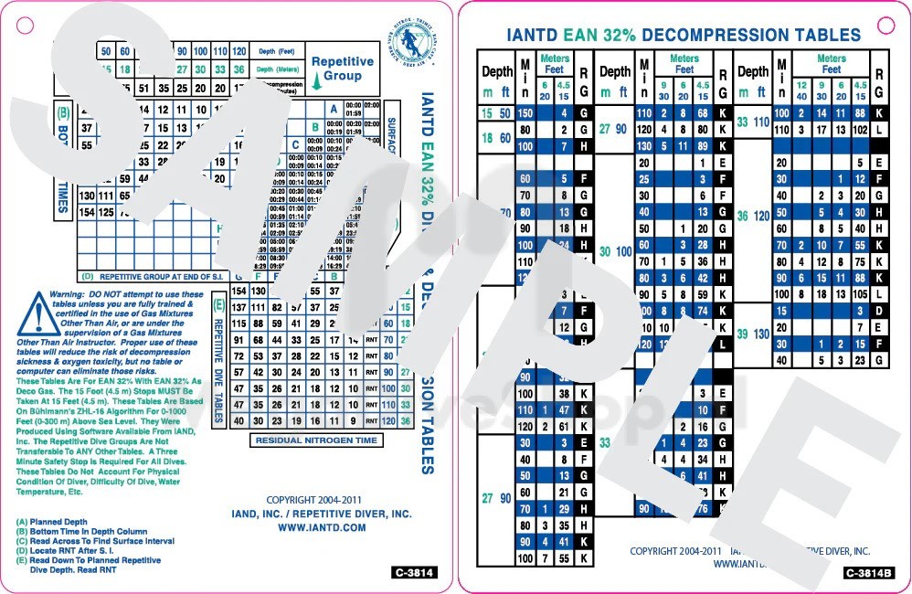 Deze tabellen zijn voor gebruik met EAN32% en EAN32% als decompressiegas. De stops op 4,5 meter diepte MOETEN op 4,5 meter diepte worden genomen. Deze tabellen zijn gebaseerd op het ZHL-16-algoritme van Bühlmann voor diepten van 0 tot 300 meter boven zeeniveau. Ze zijn gemaakt met Cybortronix DPA-software. De herhaalde duikgroep is NIET overdraagbaar naar andere tabellen. Een veiligheidsstop van drie minuten is verplicht voor alle duiken. Deze tabellen houden GEEN rekening met de fysieke conditie van de duiker, de moeilijkheidsgraad van de duik, de watertemperatuur, enz.