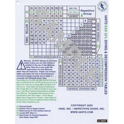 De International Association of Nitrox and Technical Divers (IANTD) heeft deze duikschema's voor 36% Nitrox opgesteld in een standaardstructuur die bekend is bij duikers die getraind zijn in het gebruik van traditionele duiktabellen. De waterdichte, flexibele duiktabellen die wij aanbieden, zijn ontworpen om de duiker tijdens de duik te vergezellen en zijn gemakkelijk onder water af te lezen. Ze zijn vrijwel onverwoestbaar en kunnen worden opgerold of opgevouwen tot een compact formaat. De tabellen zijn aan beide zijden bedrukt op witte, waterdichte stoffen vellen met speciale flexibele inkt in zwart met blauwe en/of groene accenten. Alle vellen zijn 17,8 cm x 22,9 cm (7 x 9 inch) groot, hebben afgeronde hoeken en een perforatie, zodat u meerdere vellen kunt samenvoegen tot een gemakkelijk te beheren verzameling.