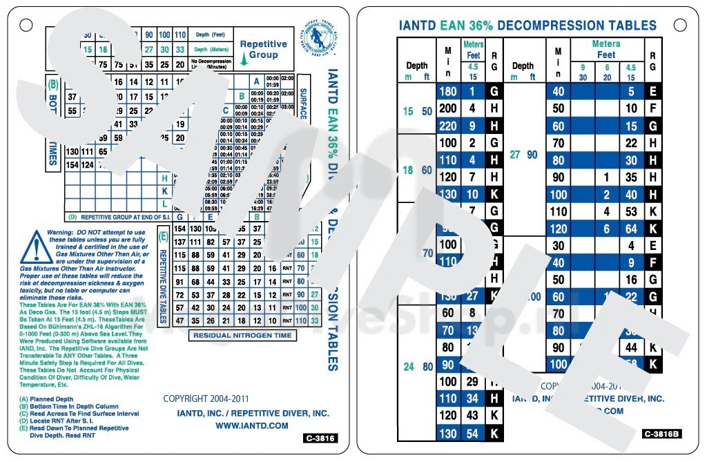 Deze tabellen zijn voor gebruik met EAN36% en EAN36% als decompressiegas. De stops op 4,5 meter diepte MOETEN op 4,5 meter diepte worden genomen. Deze tabellen zijn gebaseerd op het ZHL-16-algoritme van Bühlmann voor diepten van 0 tot 300 meter boven zeeniveau. Ze zijn gemaakt met Cybortronix DPA-software. De herhaalde duikgroep is NIET overdraagbaar naar andere tabellen. Een veiligheidsstop van drie minuten is verplicht voor alle duiken. Deze tabellen houden GEEN rekening met de fysieke conditie van de duiker, de moeilijkheidsgraad van de duik, de watertemperatuur, enz.