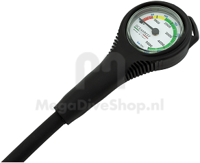 Koper beryllium spiraalgewonden; bourdonbuis; transparant venster van polycarbonaat; plastic kap met lus voor bevestiging: schaalverdeling 400 BAR/5000 PSI, volledige schaal.
